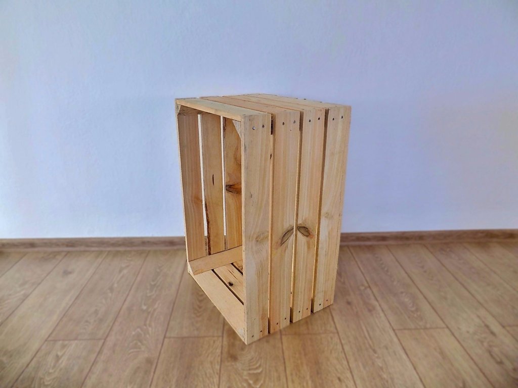 Vyrostla nám holka do krásy, a tak si vystačí sama. Klasické bedýnky bývají o 10 cm menší. Když tuto bedýnku postavíte za dveře, poslouží jako botník a nahoru si ještě odložíte klíče. Ve sklípku se z ní stane držák na víno a v obýváku ji otočíte dnem nahoru a máte podnožku nebo konferenční stolek.