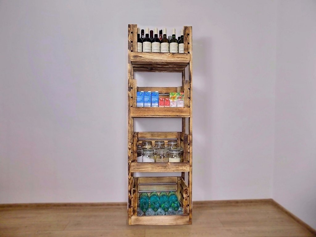 Voňavé dřevo, vzorek od borovice a česká ruční práce dávají vzniknout silným a pevným regálům. Ve čtyřech patrech se budou vyjímat knížky v malém knihkupectví, lahve archivního vína, květiny v květinářství nebo třeba nějaké roztomilé poklady z papírnictví.