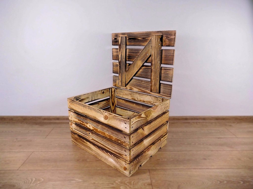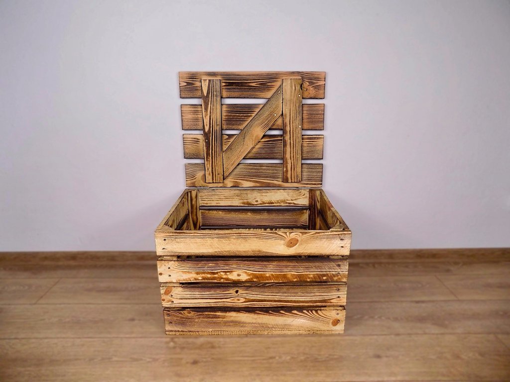 Dřevěná truhla s odklápěcím víkem o rozměrech 50x40x30 cm z masivního dřeva, opálená ohněm.